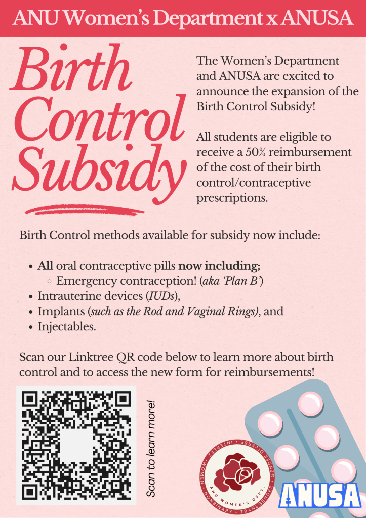 The ANU Women’s Department and ANUSA Birth Control Subsidy commenced in 2022 for all current ANU Students – undergraduate, postgraduate, coursework, and HDR! This includes students not currently enrolled in courses, provided they have an active enrolment in a program/degree.